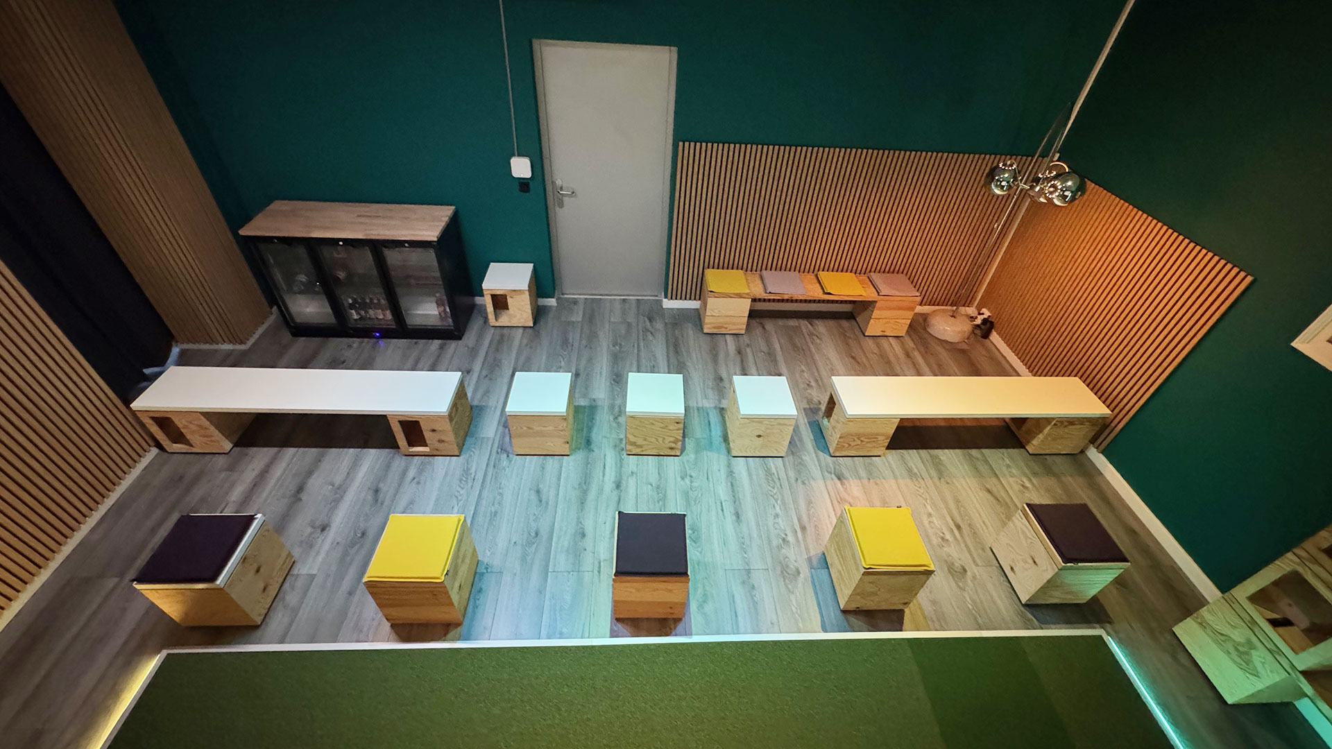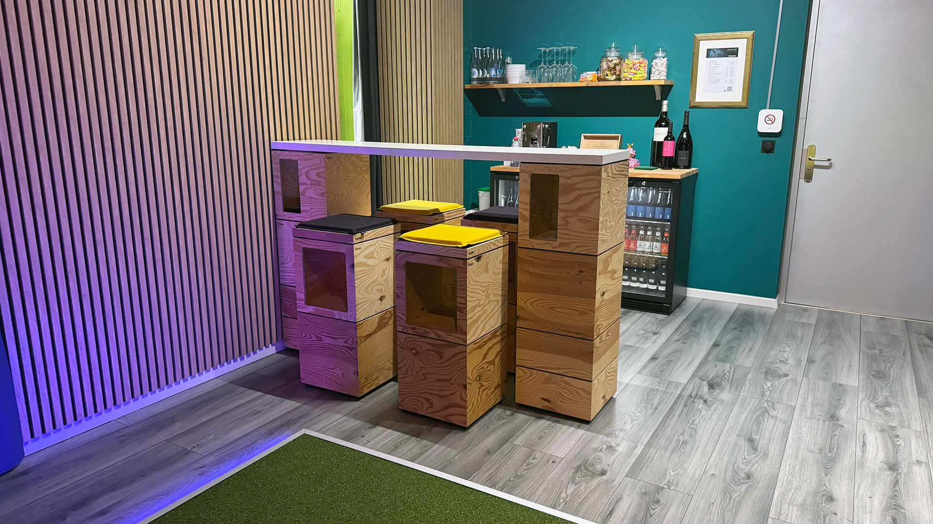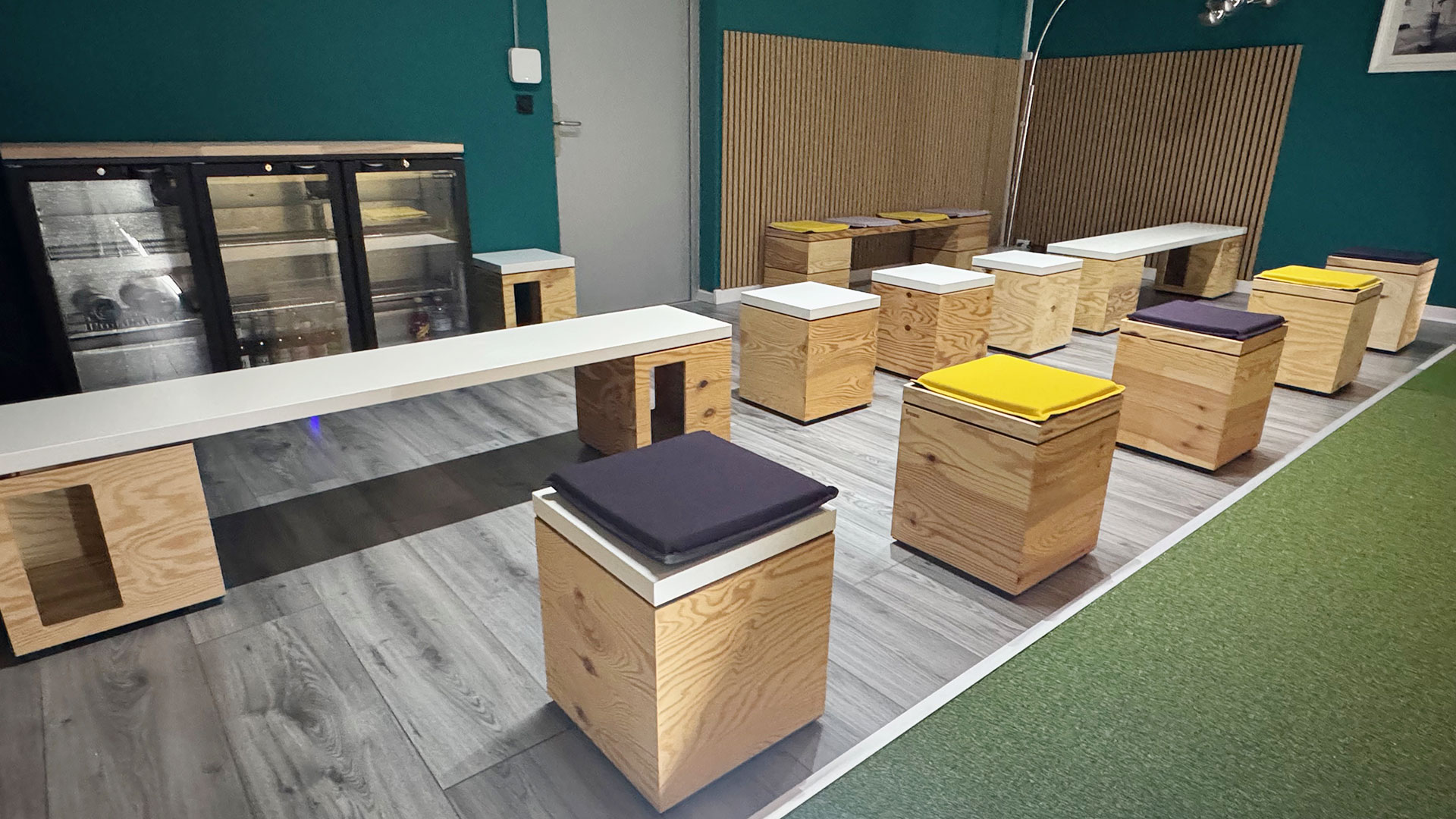 Dank des modularen Systems lässt sich der Raum genau so gestalten, wie es dein Event erfordert – von Sitzgruppen über Theken-Elemente bis hin zu Bänken. Alles kann nach Bedarf kombiniert und neu angeordnet werden –perfekt für Workshops, Seminare oder exklusive Firmen-Events.
