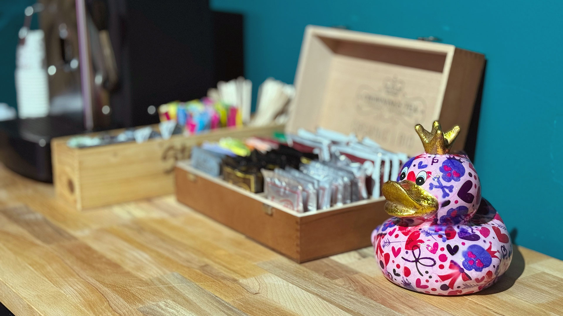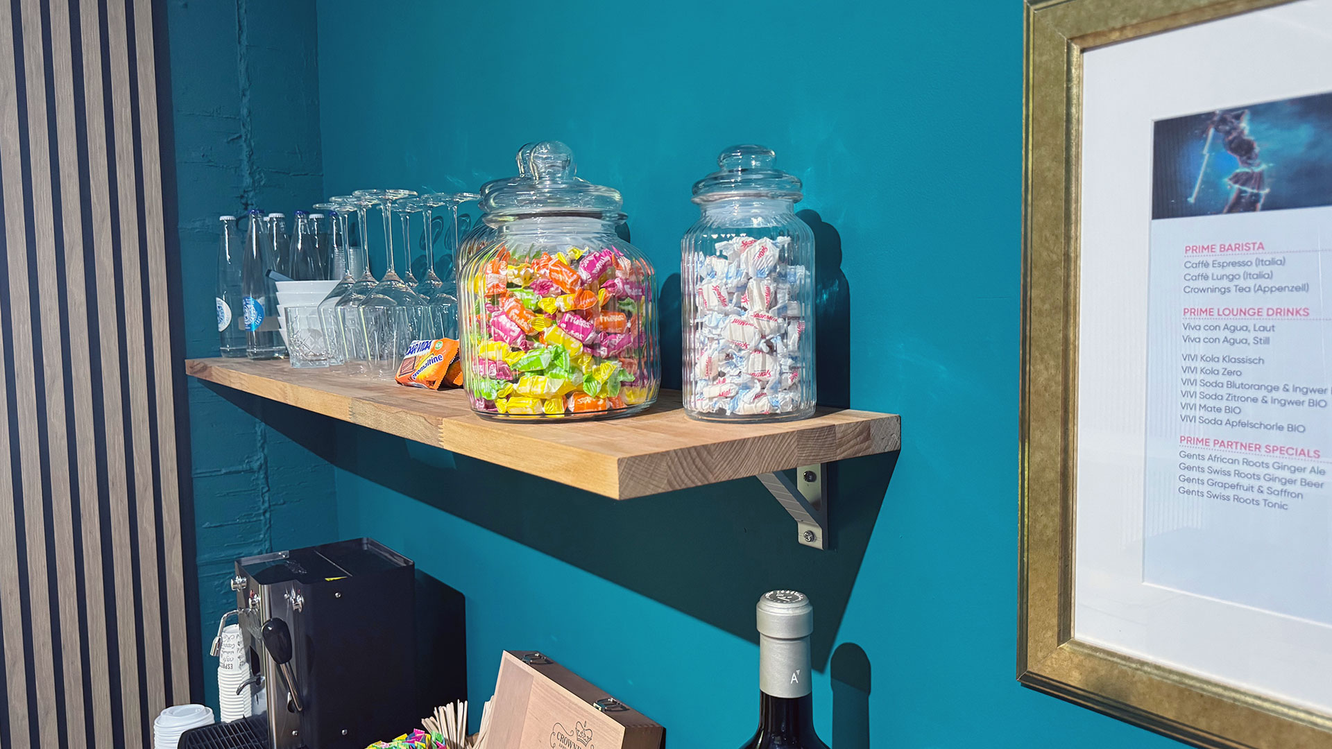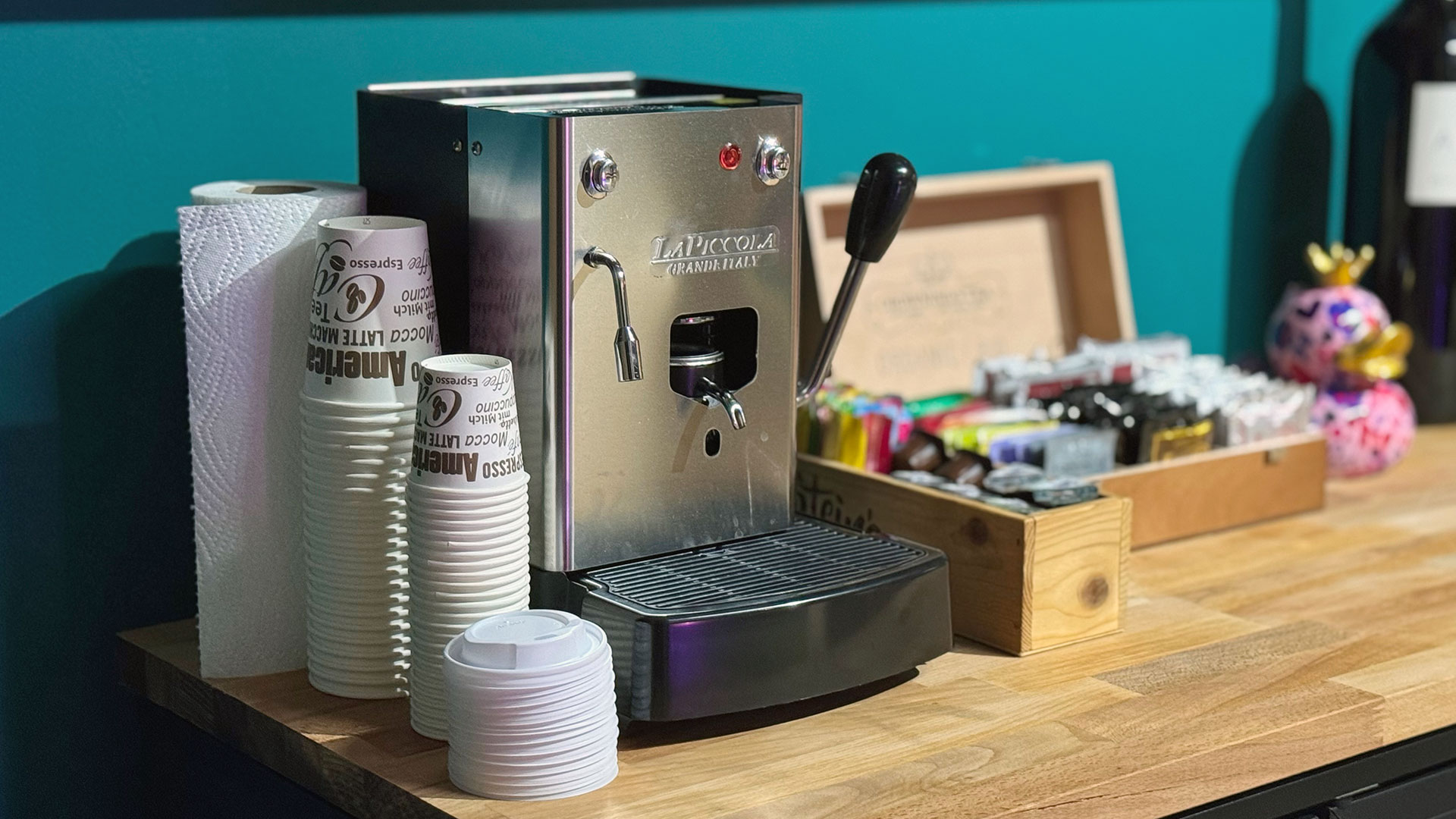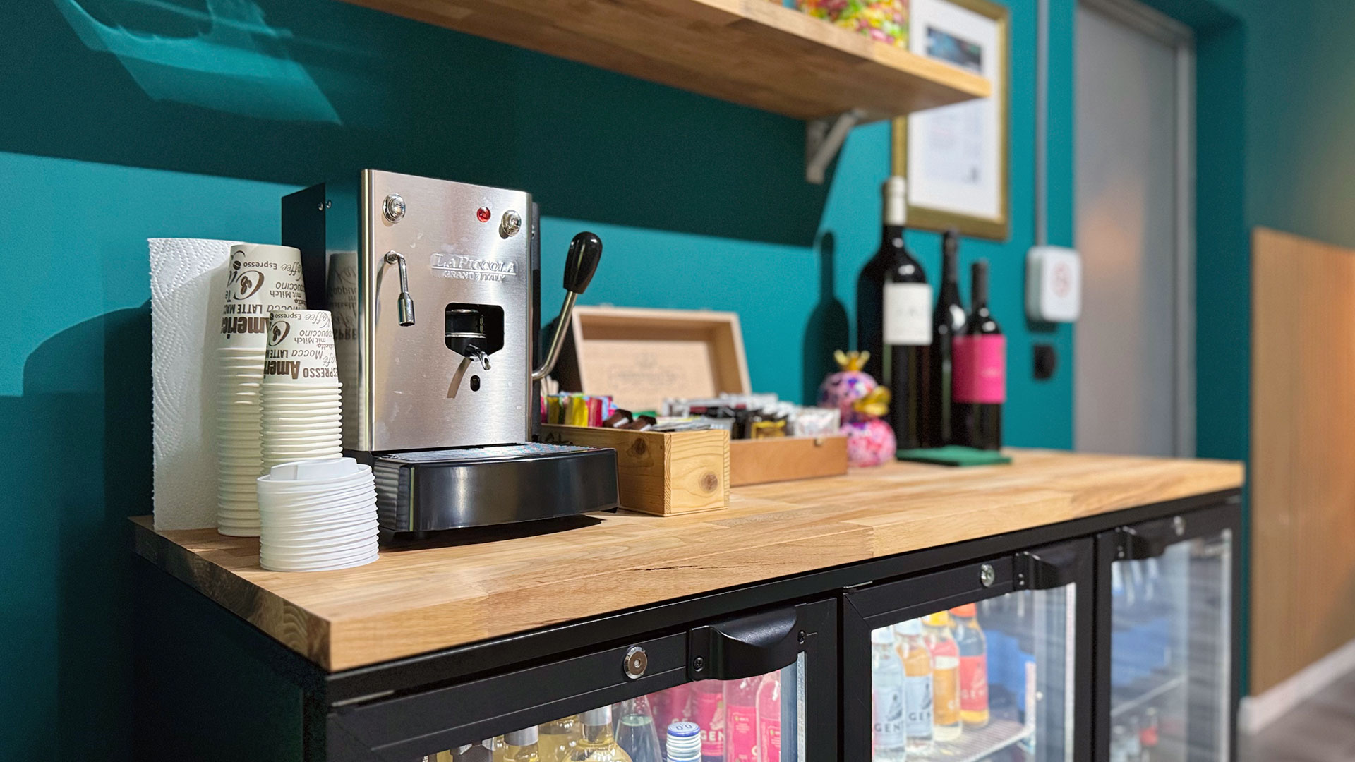 Die Bartheke ist ausgestattet mit Kaffeemaschine, Tee-Auswahl und kleinen Snacks. Auf Wunsch stehen auch regionale Getränke-Partner zur Verfügung; ein Catering ist auf Anfrage möglich.